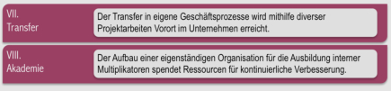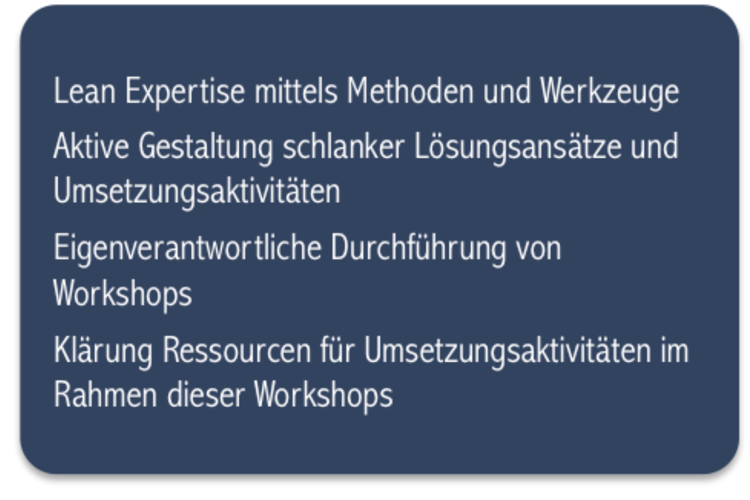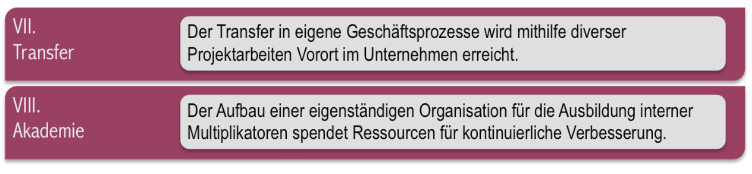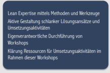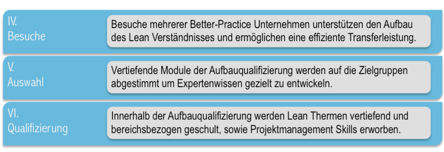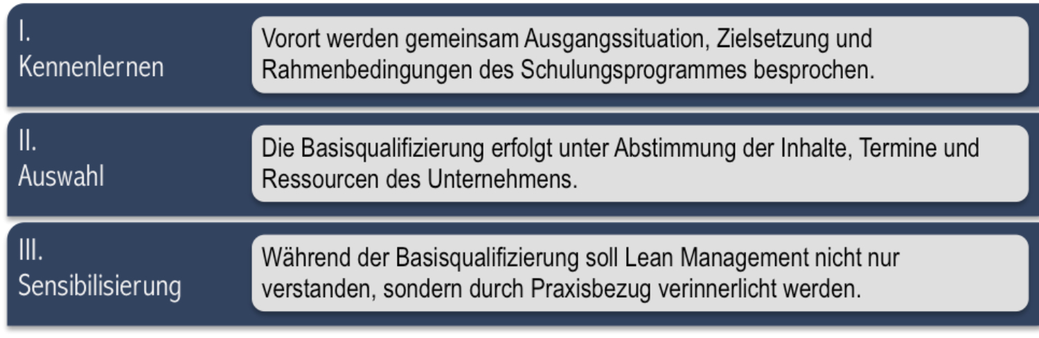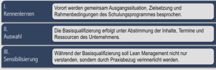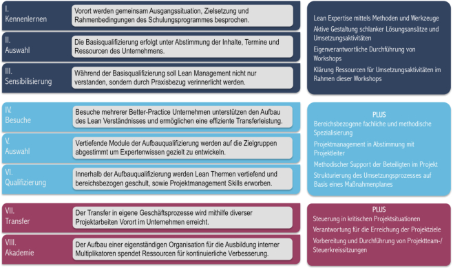 AusbildungsprogrammeDie ausgewählten Ausbildungsprogramme bieten ganzheitliche und pragmatische Ansätze. Neben dem Erlernen theoretischer Lean Grundlagen, Methoden und Werkzeuge wird vor allem die Transferleistung des erworbenen Wissens in die Unternehmenspraxis bis hin zum Aufbau einer unternehmenseigenen KVP-Organisation mit Akademie angestrebt. Die Vorgehensweise des Ausbildungsprogrammes gliedert sich in 8 Phasen, die entscheidend sind für den nachhaltigen Erfolg. Die Ergebnisse der Qualifizierung lassen sich in 3 Stufen (Basis, Aufbau I, Aufbau II) beschreiben.